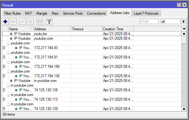 ip firewall address-list add address=m.youtube.com list=IP-Youtube