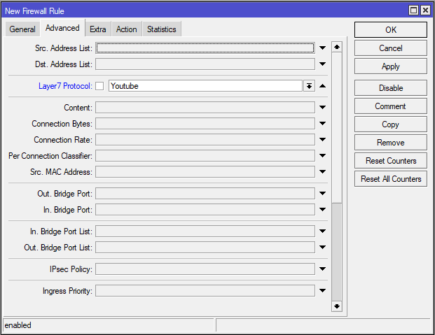 Pada menu filter rules tambahkan rules baru dengan chain forward. Pada submenu advanced berikan Youtube pada kolom L7 Protocol. Untuk memblokir traffic pilih action drop.