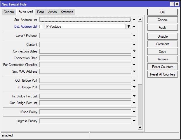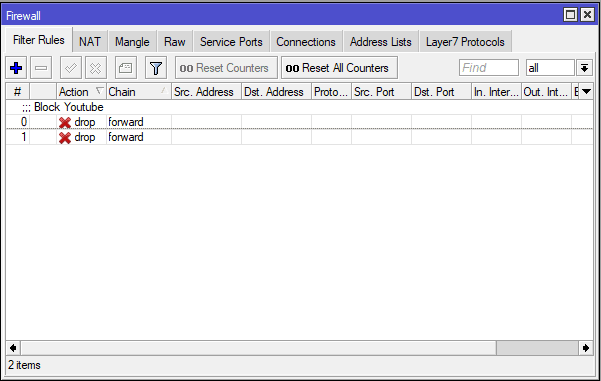 Buat kembali satu rules dengan chain forward lalu arahkan Dst Adrress List ke IP-Youtube dengan action drop.