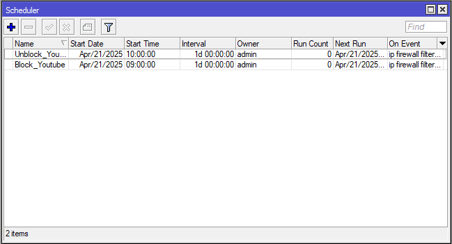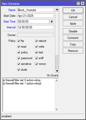 Fitur ini tersedia pada menu System > Scheduler, klik “+” untuk membuat penjadwalan baru. Berikan nama Block_Youtube atur start time sesuai keperluan. Interval berfungsi untuk mengatur penjadwalan berikutnya. Untuk postingan ini akan dilakukan blokir youtube pada jam 9 hingga 10 setiap hari. Pada kolom On Event berikan perintah untuk mengubah action firewall filter menjadi drop. Angka 0 dan 1 adalah urutan rules yang sedang digunakan.