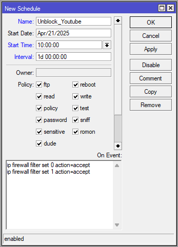 Buat kembali rules untuk mengizinkan traffic youtube pada jam 10 dengan mengubah action perintah pada kolom On Event.