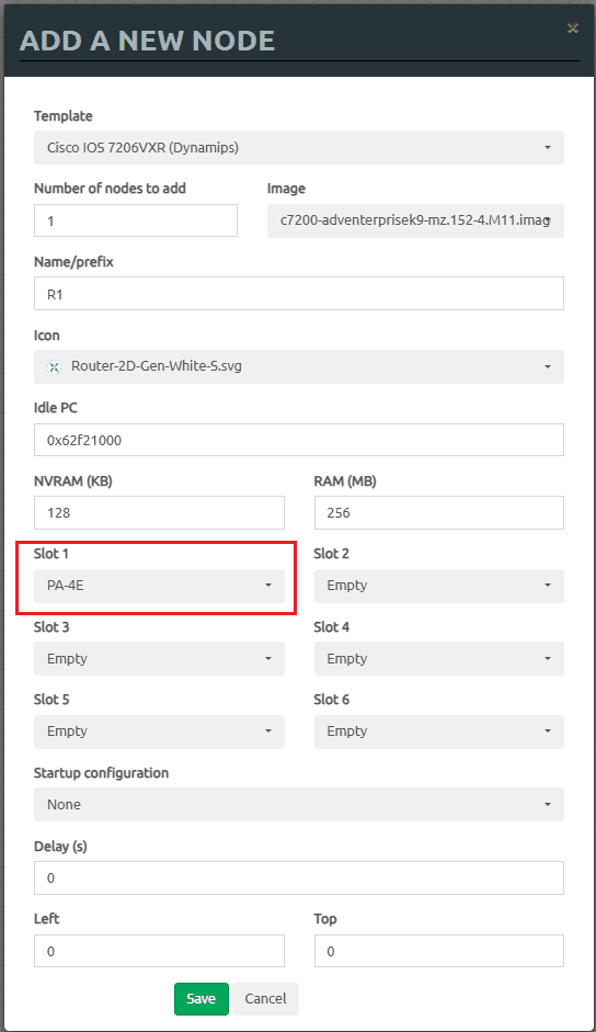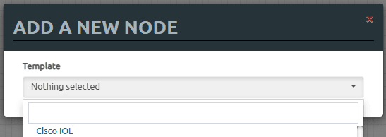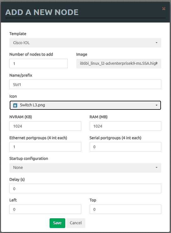 Buat node baru dengan opsi Cisco IOL. Setelah itu rubah setelan node seperti gambar dibawah.
