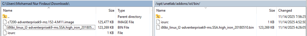 Donwload file bin IOL i86bi_linux_l2-adventerprisek9-ms.SSA.high_iron_20180510 dan file lisensi IOURC. Pindahkan ke mesin virtual EVE-NG dengan folder destinasi seperti gambar berikut menggunakan Winscp.