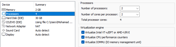 Aktifkan tiga fitur virtualization engine berikut pada setelan mesin virtual EVE-NG.