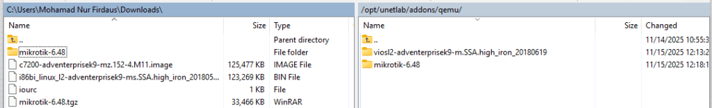 Pindahkan ke dalam sistem operasi EVE-NG menggunakan WinSCP melalui ip address, username dan password EVE-NG.