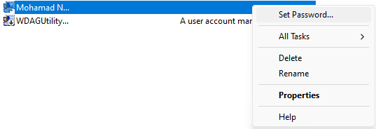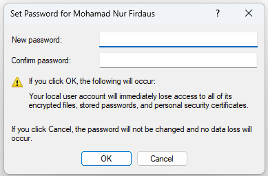 Buka Computer Management > Local Users and Group > User lalu berikan password untuk user yang sedang digunakan.