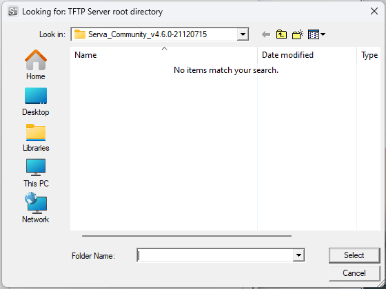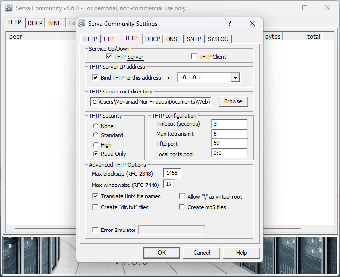 Buka aplikasi Serva Comunnity kemudian klik setting dan masuk pada tab TFTP.