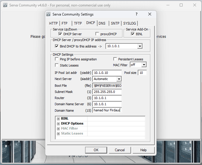 Masuk pada tab DHCP kemudian konfigurasikan seperti gambar dibawah. Jika sudah close aplikasi serva community lalu buka kembali aplikasi tersebut. Hal ini dilakukan untuk merestart konfigurasi yang telah diberikan sebelumnya.