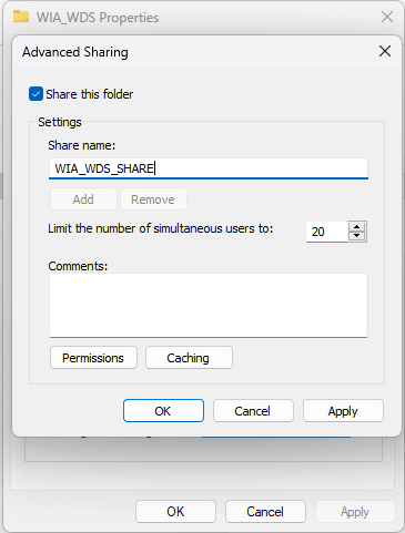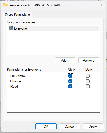 Klik properties pada folder WIA_WDS kemudian masuk pada tab sharing > advanced sharing centang pilihan share this folder. Berikan nama WIA_WDS_SHARE klik permissions lalu allow semua hak akses.