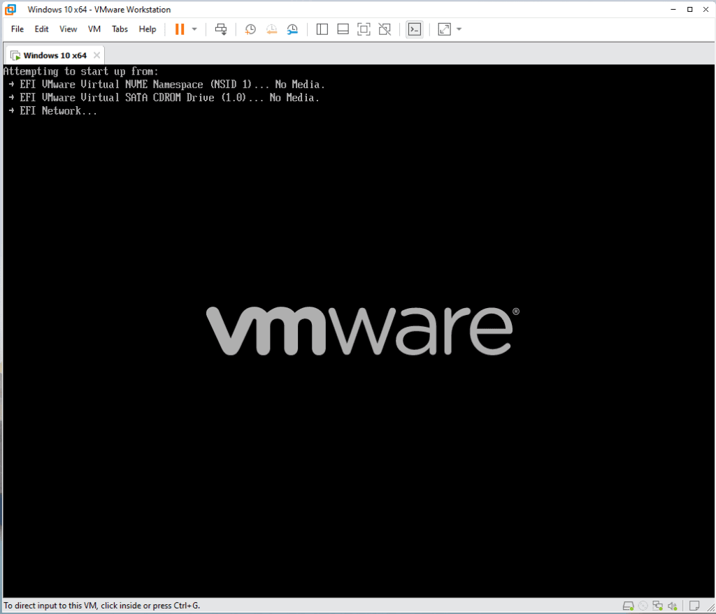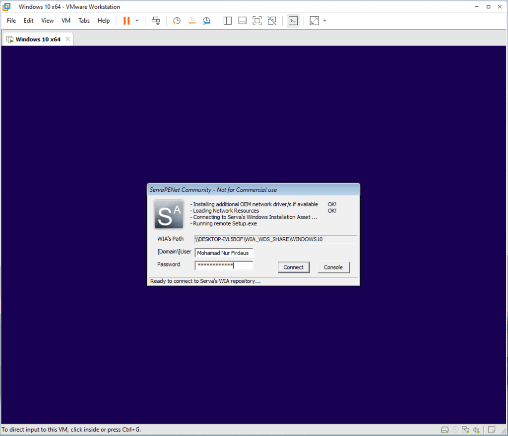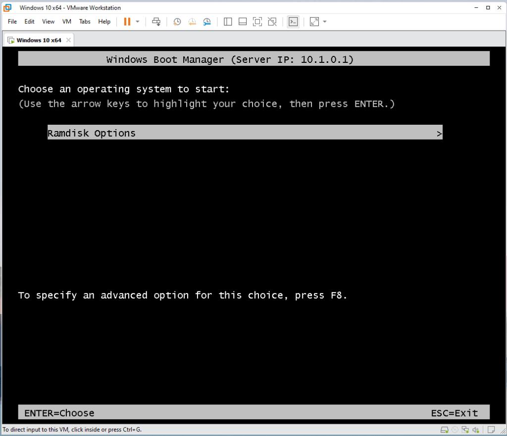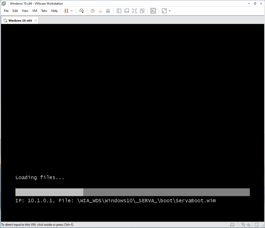 Close dan buka kembali aplikasi serva community klik tab logs untuk melihat riwayat konfigurasi. Jika sudah muncul WIA_WDS_SHARE OK seharusnya TFTP Server sudah bisa digunakan. Untuk percobaan buat satu mesin virtual dan arahkan network adapter menggunakan vmnet 1. Jalankan mesin virtual tersebut jika masuk ke booting melalui network akan muncul seperti gambar dibawah.
