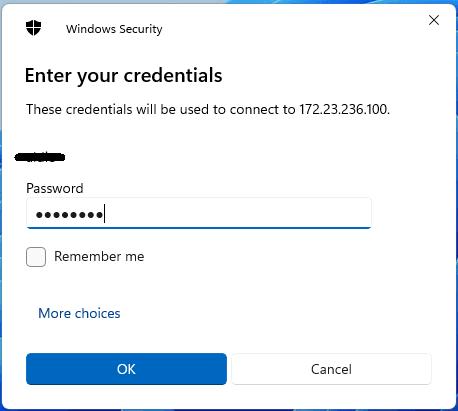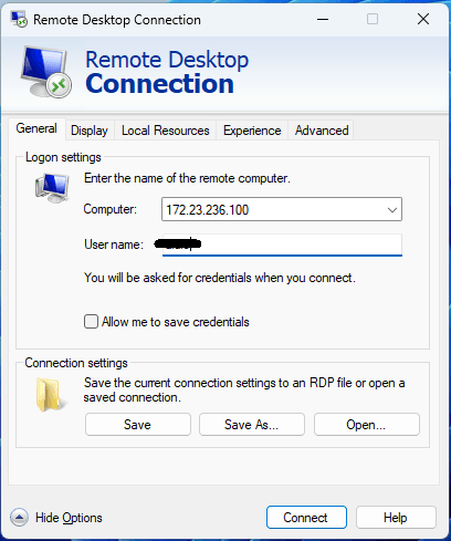 PC RDP mempunyai ip address 172.23.236.100, ip tersebut digunakan pada PC Local untuk melakukan koneksi RDP. Buka fitur Remote Desktop Connection pada PC Local lalu masukan ip address dan username PC RDP.