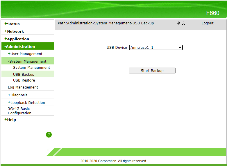Koneksikan USB ke modem pada port USB yang tersedia, USB harus menggunakan format FAT32 agar bisa terbaca oleh modem. Masuk dengan akun user kedalam modem lalu cari menu USB Backup dan lakukan start backup.