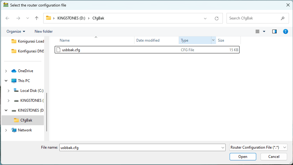 Matikan antivirus terlebih dahulu dan buka aplikasi routerpassview klik open router config file. Arahkan ke file USB yang sudah dibackup pada langkah sebelumnya.