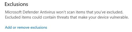 Scroll pada bagian bawah hingga menu Exclusions kemudian klik Add or remove exclusions. Fitur ini berfungsi untuk mengecualikan file atau folder untuk tidak di scan oleh windows defender.
