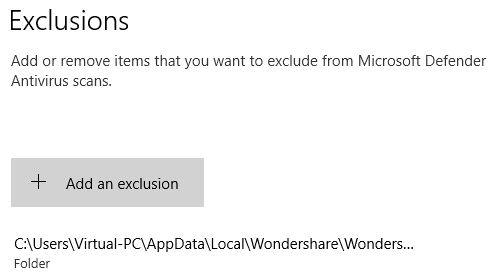 Lokasi folder tersebut sudah dikecualikan untuk di scan windows defender.