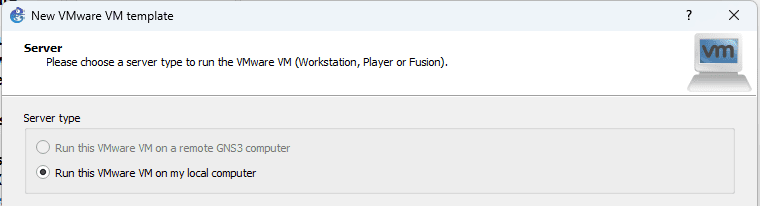 Pada menu Preferences > VMware VMs klik new lalu klik next pada pilihan server GNS3.