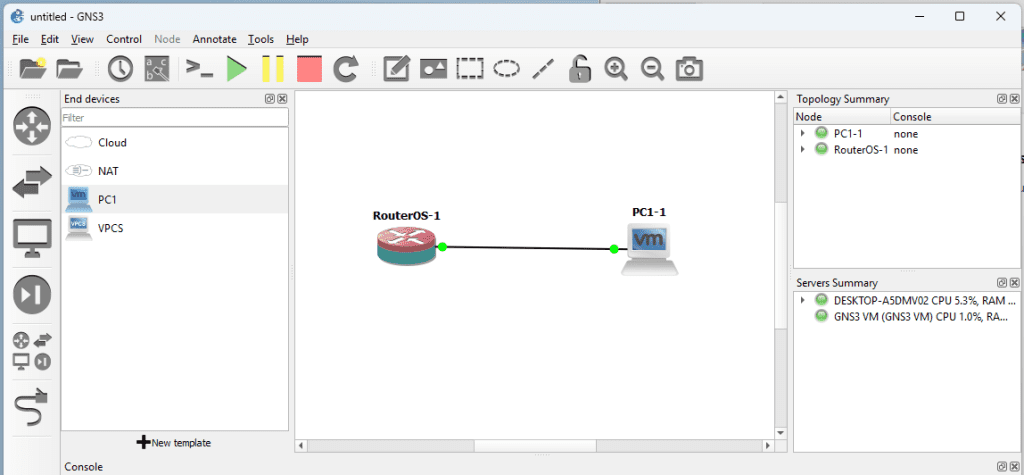 Simpan dan hubungkan RouterOS dan PC1 pada GUI topologi GNS3.