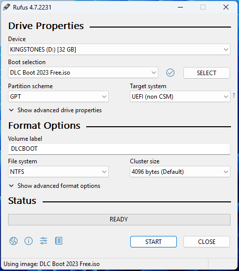 Untuk membuat DLC Boot kedalam bootable USB Drive gunakan aplikasi rufus. Pilih USB Drive yang ingin digunakan dan pilih jenis system disk MBR/GPT sesuaikan dengan tujuan sistem operasi yang hendak akan dilakukan reset password.