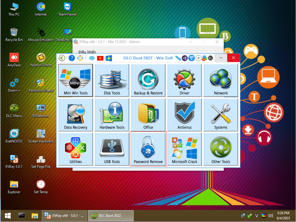 Tunggu hingga tampilan masuk pada desktop mini windows 10 DLC Boot seperti gambar dibawah. Untuk mereset password pilih menu password remover.