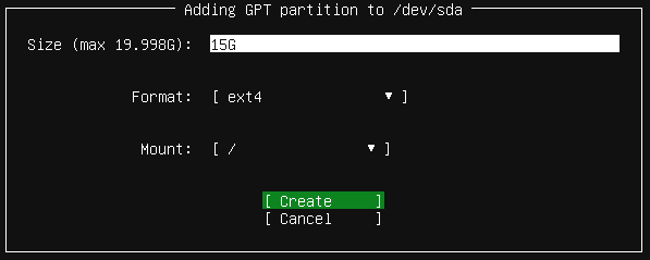 Pada bagian list hardisk pilih partisi dengan free space lalu pilih opsi create dan berikan alokasi untuk direktori /.