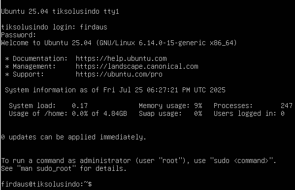 Linux Ubuntu adalah salah satu distro linux yang cukup terkenal. Linux Ubuntu banyak digunakan untuk keperluan desktop harian. Hal tersebut dikarenakan update yang diberikan oleh pengembang distro ini cukup memuaskan. Linux Ubuntu OS didasarkan pada distribusi Debian Linux dan dikembangkan oleh Canonical Ltd, perusahaan yang didirikan oleh entrepreneur Afrika Selatan Mark Shuttleworth. Selain untuk keperluan harian desktop distro linux ini juga menyediakan update untuk keperluan server. Pada postingan ini akan dijelaskan instalasi linux ubuntu server 25.04 di VMware. Preconfig sudah dilakukan yaitu dengan membuat satu virtual mesin pada aplikasi vmware.
