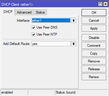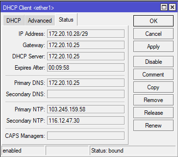 Masuk pada menu IP > DHCP Client, tambahkan untuk ether1. Pindah ke submenu status untuk melihat alamat DHCP Server.