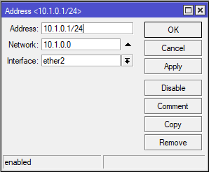Konfigurasi alamat ip ether2 yang mengarah pada jaringan klien di menu IP > Address >”+”.