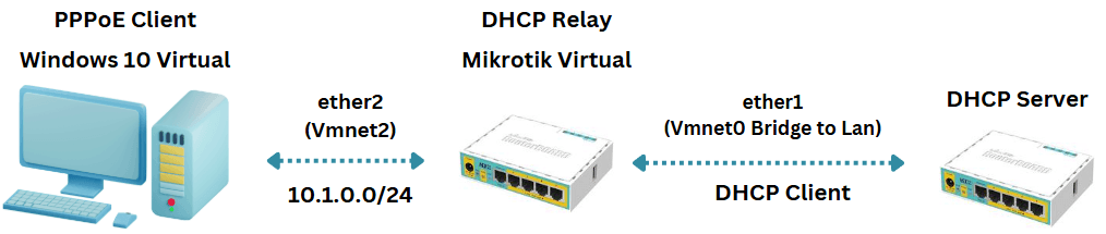 DHCP Relay adalah suatu protokol untuk meneruskan DHCP Server ke jaringan tertentu. Metode ini digunakan jika di suatu subnet tidak mempunyai server dhcp dan berfungsi sebagai perantara. Agen relay berfungsi untuk untuk meneruskan perutean ip address ke sebuah subnet dan menwarkan request DHCP ke client yang dituju. DHCP adalah protokol yang secara otomatis memberikan alamat IP dan informasi konfigurasi jaringan kepada perangkat yang terhubung ke jaringan. Dengan DHCP, administrator jaringan tidak perlu melakukan konfigurasi manual pada setiap perangkat. Pada postingan ini akan dijelaskan konfigurasi dhcp relay pada router mikrotik. Sebelumnya sudah dilakukan preconfig dasar mikrotik pada mikrotik DHCP Server.