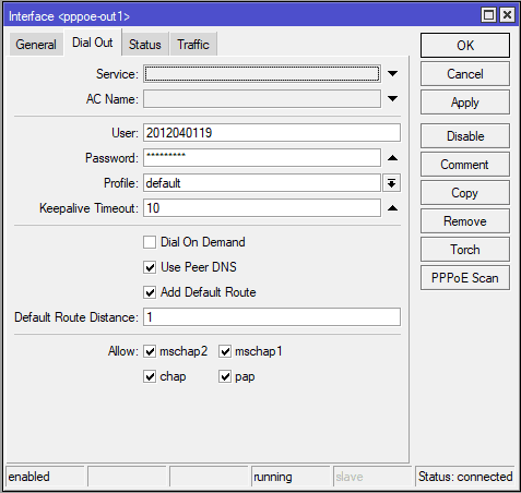 Pada tab general pilih internface ether1 atau yang mengarah ke modem ISP. Berikan username dan password pppoe ISP pada menu dial out. Untuk mendapatkan username dan password pppoe ISP ada dalam postingan Cara Melihat Username Password PPPoE Client ISP. Jika sudah centang pilihan use peer dns serta add default route klik apply dan pastikan status connected.