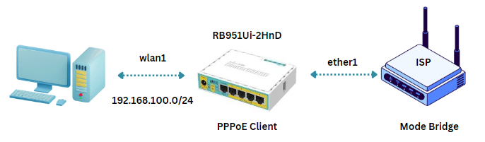 Point-to-Point Protocol over Ethernet (PPPoE) adalah protokol jaringan yang memfasilitasi komunikasi antar titik akhir jaringan. PPPoE merangkum frame Point-to-Point Protocol (PPP) di dalam frame Ethernet, menawarkan manfaat yang sama seperti PPP, sekaligus menyediakan konektivitas di seluruh jaringan Ethernet. Setiap ISP biasanya menggunakan protokol ini yang memungkinkan dial up koneksi dengan menggunakan otentikasi username password. Pada postingan kali ini akan dijelaskan konfigurasi pppoe client ISP yang dipindahkan ke perangkat router mikrotik.