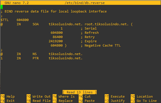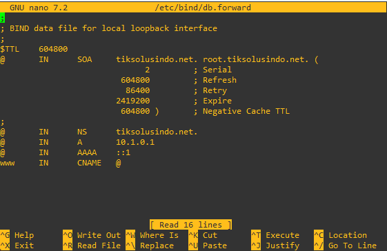 Buka file db.forward kemdudian ganti semua localhost menjadi alamat domain yang akan dibuat pada postingan ini diberikan tiksolusindo.net serta ganti alamat ip loopback menjadi alamat ip linux debian. Buat satu subdomain www dengan menggunakan NS CNAME.