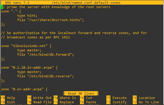 Koneksikan forward dan reverse zone melalui file default zones yang berada pada /etc/bind dengan nama named.conf.default-zones. Buka file tersebut untuk ubah file db.local dan db.127 menjadi file db.forward dan db.reverse. Pada baris zone forward ubah menjadi alamat domain yang digunakan, pada baris zone reverse berikan net id lokal dengan urutan terbalik.