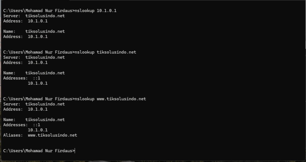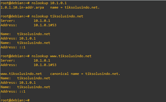 Restart service bind9 dan lakukan pengujian dengan perintah nslookup. Jika muncul tampilan dari nslookup konfigurasi DNS Server sudah berhasil digunakan.