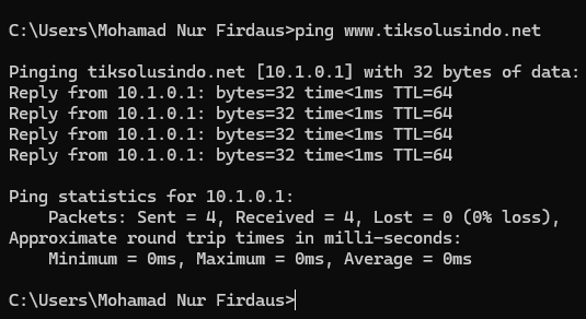 Pada komputer lakukan pengecekan nslookup dan ping pada alamat domain pada cmd, jika tampilan muncul seperti gambar dibawah maka dns sudah ter resolv juga oleh komputer lokal.