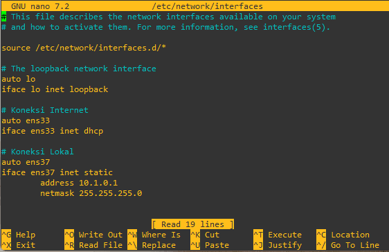 Pada linux debian berikan alamat ip DHCP pada interface ens33 dan ens37 static ke jaringan lokal. Untuk menyimpan konfigurasi pada fil dengan cara CTRL + O lalu Enter dan keluar dari file dengan menggunakan CTRL + X.