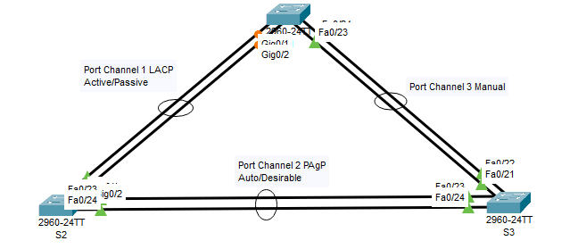 2 Po2(SU) PAgP Fa0/23(P) Fa0/24(P) S3#show etherchannel summary