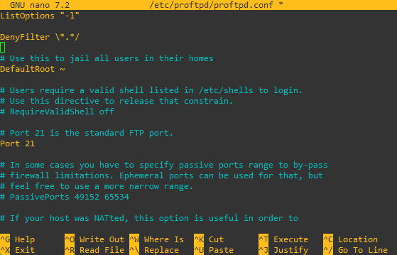 root@debian:~# nano /etc/proftpd/proftpd.confCari barisan DefaultRoot kemudian hapus tanda pagar. Hal ini berfungsi agar setiap client menggunakan folder home default masing – masing ketika mengakses FTP Server.