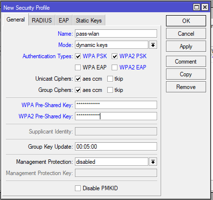 Masuk pada menu Wireless > Security Profile berikan nama profile dan jenis otentikasi WPA PSK/WPA2 PSK.