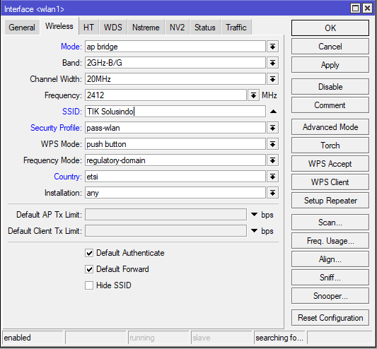 Berikan mode ap bridge, SSID dan security profile di menu Wireless > Interface > wlan1 tab Wireless.