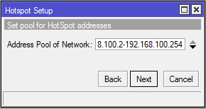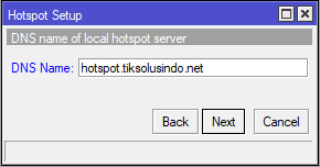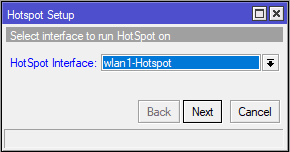 Fitur ini tersedia pada menu IP > Hotspot > Hotspot Setup. Pilih interface yang akan diberikan fitur otentikasi hotspot.