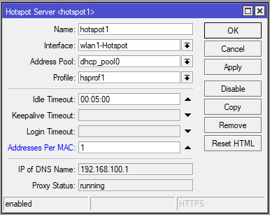 Konfigurasi limitasi mac address device agar satu akun hanya bisa dipakai satu mac address pada menu IP > Hotspot > Servers > hotspot1.