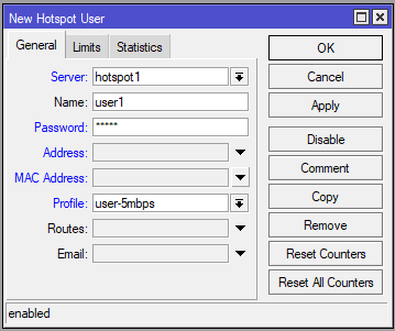 Lakukan hal yang sama dan buat buat limitasi bandwidth 5M/5M. Jika sudah buat username dan password akun serta berikan user profile yang sudah dibuat tadi pada menu IP > Hotspot > Users.