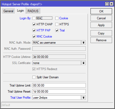 Masuk pada menu IP > Hotspot > Server Hotspot > hsptof1 > Login. Centang seperti gambar dibawah lalu aktifkan fitur trial untuk user percobaan serta berikan user profile user-2mbps.