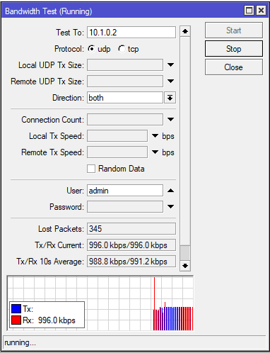 Pengujian dilakukan dengan menggunakan tools bandwidth test yang tersedia pada mikrotik.Pada MikrotikCHR-1 masuk pada menu Tools > Bandwidth Test, berikan alamat ip 10.1.0.2 atau alamat ip MikrotikCHR-2 dengan protokol UDP dengan direction both (TX/RX).