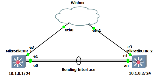 Bonding pada perangkat mikrotik adalah suatu cara untuk membuat aggregat link beberapa port fisik menjadi 1 interface virtual. Dengan menggabungkan beberapa port fisik memungkinkan untuk membuat bandwidth menjadi lebih besar dan meningkatkan redudansi link jika salah satunya mengalami gangguan. Mikrtotik mendukung beberapa protokol diantaranya yang paling banyak digunakan yaitu LACP. Pada postingan ini akan dijelaskan konfigurasi interface bonding pada mikrotik. Sebelumnya sudah dilakukan preconfig yaitu instalasi GNS3 VM dan importing Mikrotik CHR ke aplikasi GNS3.