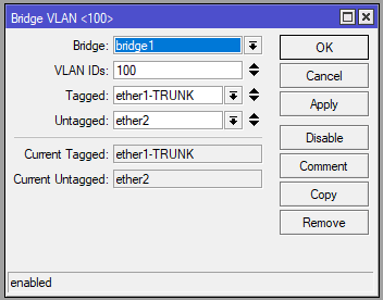 Untuk mengaktifkan konfigurasi VLAN masuk pada menu Bridge lalu klik bridge1 pilih submenu VLAN dan aktifkan VLAN Filtering.