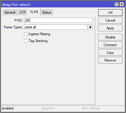 Pada interface ether2 dan ether3 berikan masing – masing vlan access pada submenu VLAN.