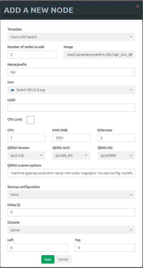 Pada konfigurasi kali ini node SW1 dan SW2 menggunakan appliance Cisco vIOS Switch dengan spesifikasi seperti berikut.