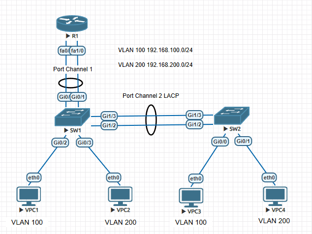 EtherChannel memungkinkan beberapa tautan Ethernet fisik digabungkan menjadi satu tautan logis. Jika sebuah segmen dalam EtherChannel down, lalu lintas yang sebelumnya dibawa melalui tautan yang down beralih ke yang tersisa segmen dengan di EtherChannel. Inter Vlan Routing adalah suatu metode menghubungkan beberapa VLAN agar bisa terkoneksi dalam suatu sub interface yang sama. Pada postingan ini akan dijelaskan konfigurasi intervlan routing etherchannel menggubakan simulator Eve-NG.