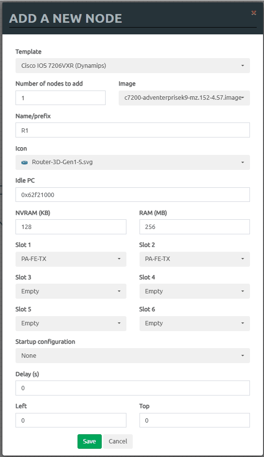 Pada konfgurasi ini node R1 menggunakan appliance router dynamips dengan spesifikasi seperti berikut.